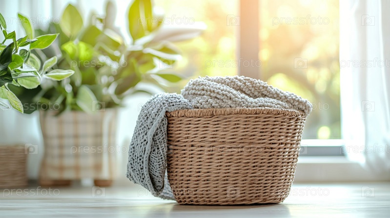 Уютная тканая корзина с мягким одеялом в яркой, заполненной зеленью комнате, идеально подходит для отдыха и комфорта