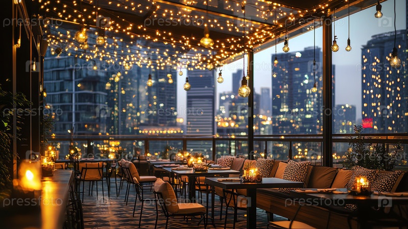 Уютный лаундж на крыше с потрясающим городским небом в сумерках, идеально подходит для отдыха и социальных встреч