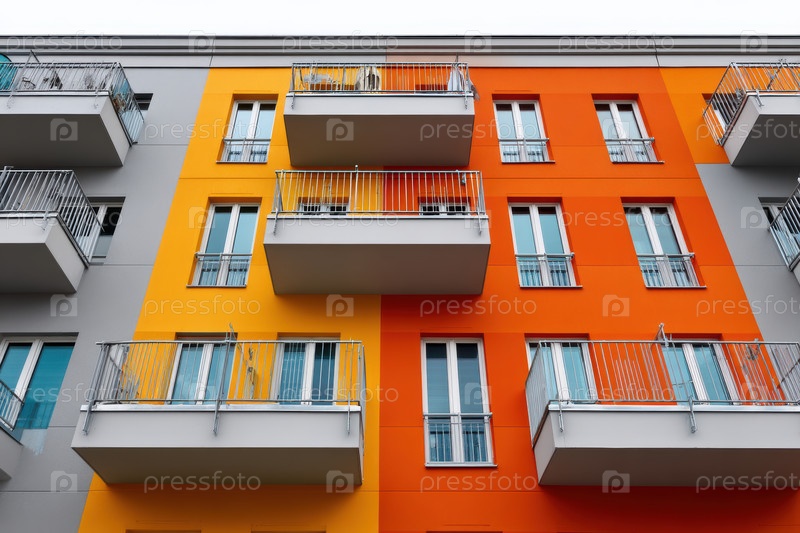 Красочный современный фасад многоквартирного дома, демонстрирующий желтые карнизы, красную вертикальную панель, уложенные балконы с металлическими перилами, сетку окон, бетон