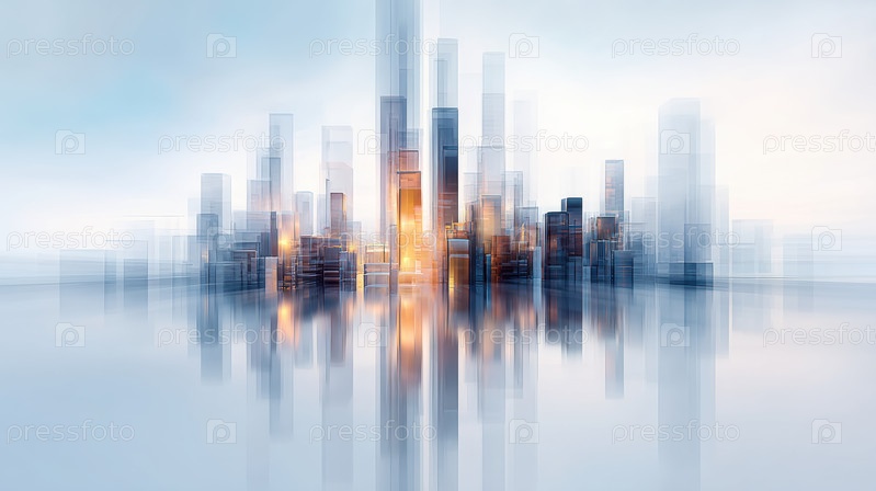 Абстрактный футуристический горизонт города, отраженный в стеклянных небоскребах, динамических световых полосах, размытом движении, цифровом свечении, предполагающем умный город и AIdriven