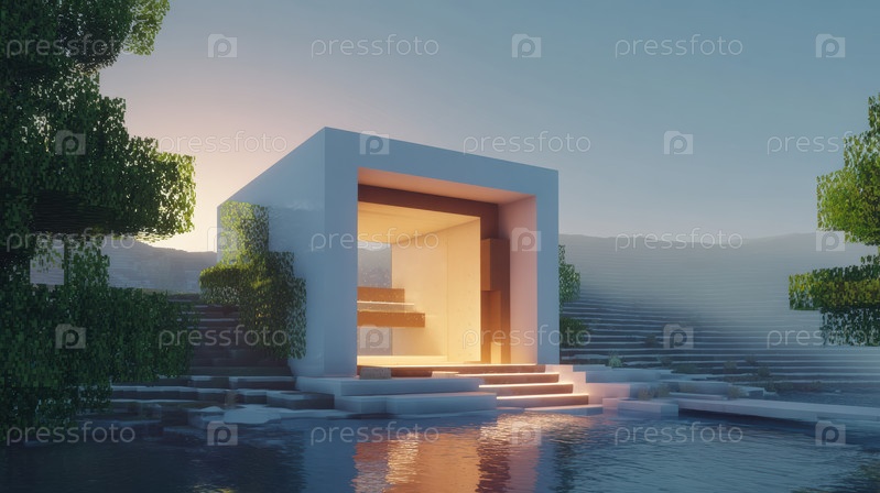 Минимальное отступление куба в сумерках тепло освещенный, нетронутый бетонный павильон, сидящий рядом с отражающим бассейном, янтарное внутреннее свечение, пышные кустарники и горный силуэт,