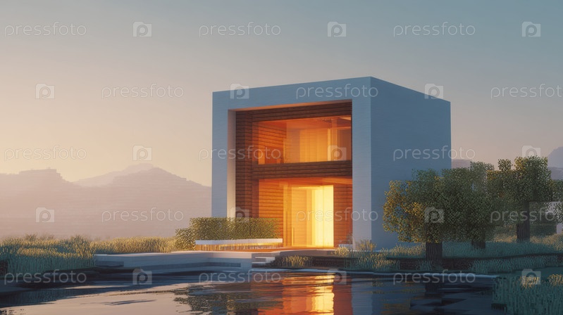 Минимальное отступление куба в сумерках тепло освещенный, нетронутый бетонный павильон, сидящий рядом с отражающим бассейном, янтарное внутреннее свечение, пышные кустарники и горный силуэт,