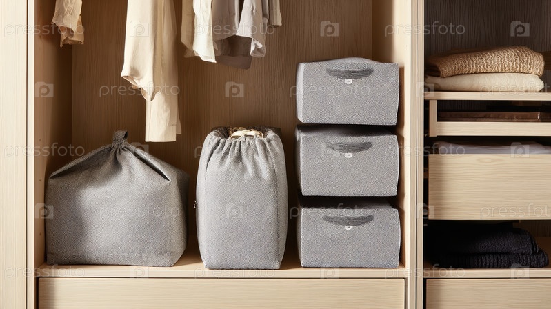 Упорядоченный шкаф с узорчатыми корзинами, Деревянный шкаф, содержащий складное белье и висячий текстиль, Гладкий минималистский шкаф с плетеными корзинами и нейтральными тонами