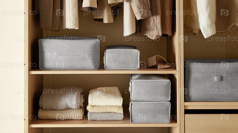 Аккуратно организованный деревянный шкаф с узорчатыми корзинами для хранения. сложенное белье, уложенное в открытые ящики, висячий текстиль сверху, нейтральная цветовая палитра, мягкая