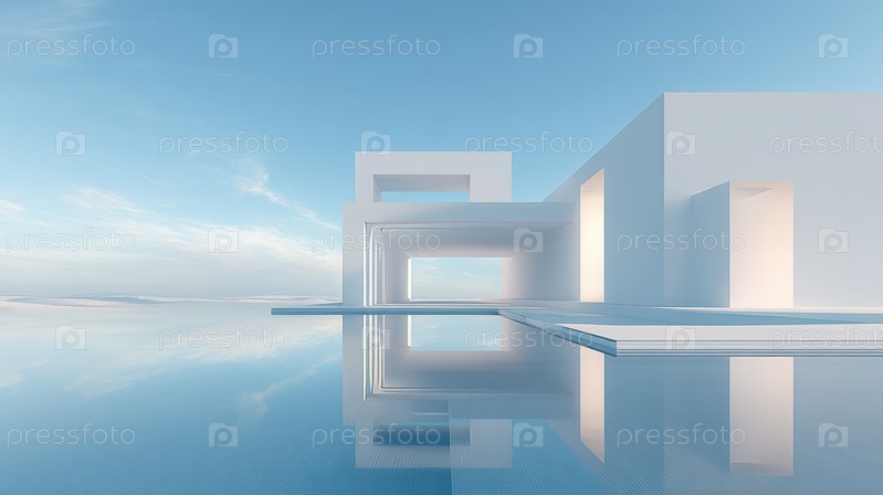 Белая геометрическая структура под ярким небом, чистые угловые объемы и плавающие блоки над неглубоким отражающим бассейном, четкие тени и обширные негативные