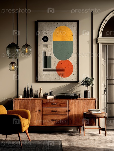 Гостиная середины века с деревянным боком, абстрактным геометрическим плакатом, бархатным креслом, подвесными лампами, проигрывателем, керамическими вазами и теплым комнатным растением