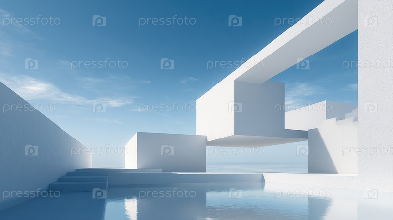 Современные геометрические структуры, абстрактная архитектура с гладкими отражающими поверхностями, футуристические геометрические конструкции зданий с отражениями поверхности воды и минимализмом