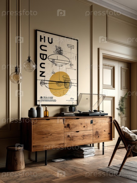 Гостиная середины века с деревянным боком, абстрактным геометрическим плакатом, бархатным креслом, подвесными лампами, проигрывателем, керамическими вазами и теплым комнатным растением