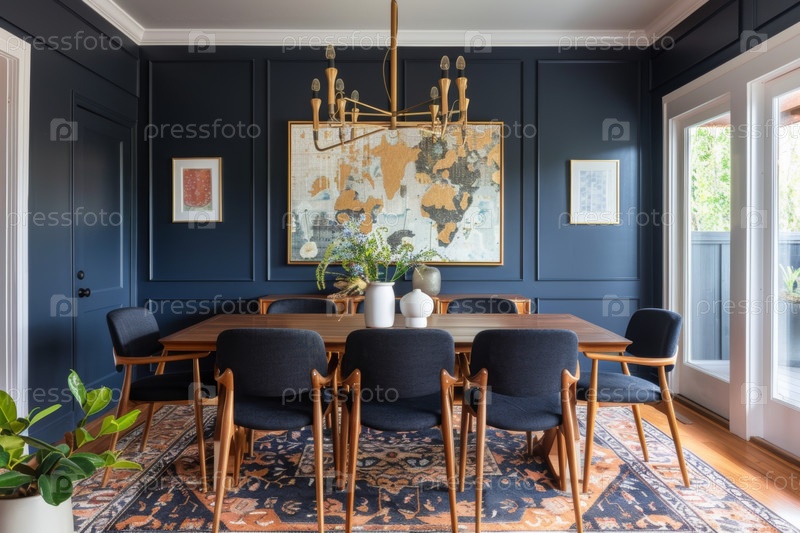 Элегантная синяя столовая, украшенная современным декором и шикарными аксессуарами для привлекательной атмосферы