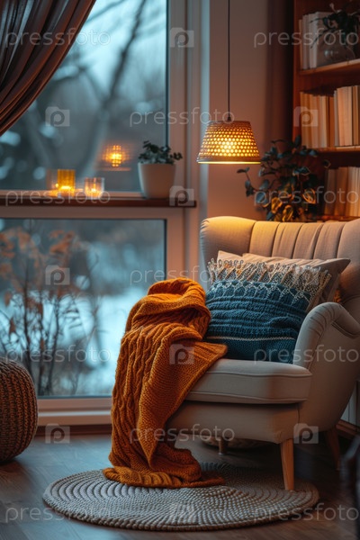 Безмятежный уголок с плюшевым креслом, теплым светом и мягким текстилем, идеально подходит для отдыха и комфорта