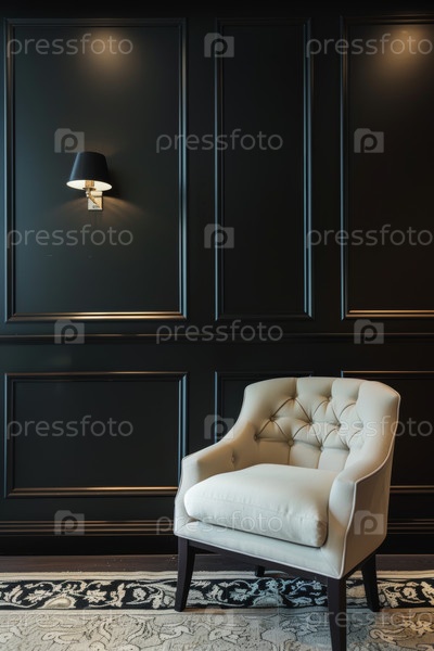 Два кремовых кресла в темнопанельном салоне, поставленные для консультации по дизайну с латунным боковым столом, текстурированный ковер, горшечный фикус, скульптурные настенные бра, приглушенные