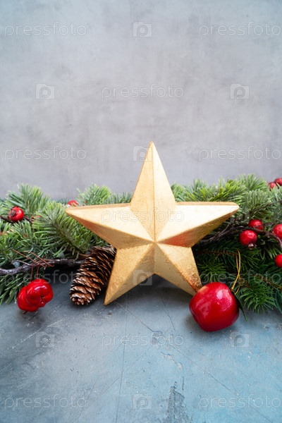 Сосновые ветви с золотым звездным центральным элементом, замороженные красные ягоды и деревенский пинекон на прохладной текстурированной поверхности, безмятежная минималистская праздничная композиция, передающая