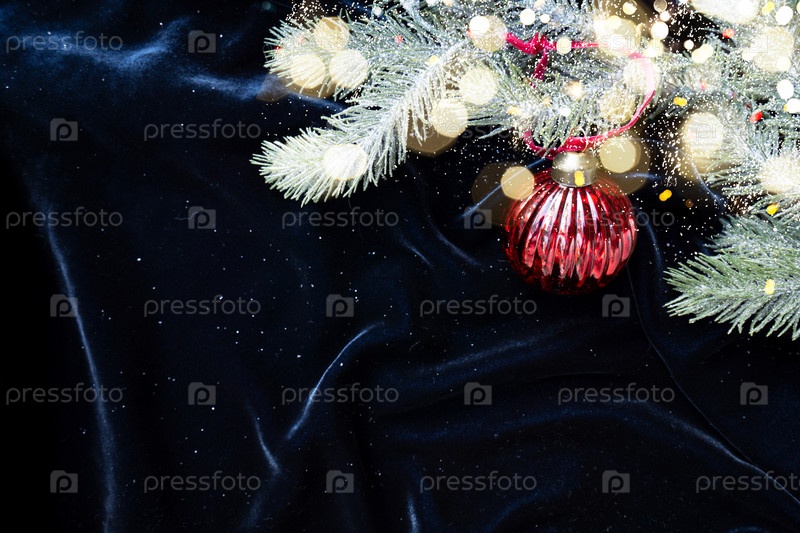 Коробка с винтажными рождественскими украшениями демонстрируется на фоне серебряной ткани, создавая праздничную выставку