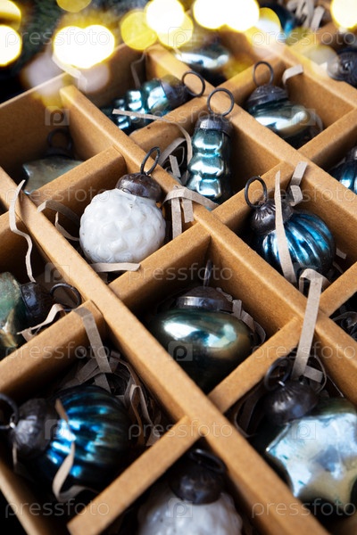 Коробка старинных рождественских украшений в зеленом и синем цветах на фоне серебряной ткани, готовая к праздничному убранству