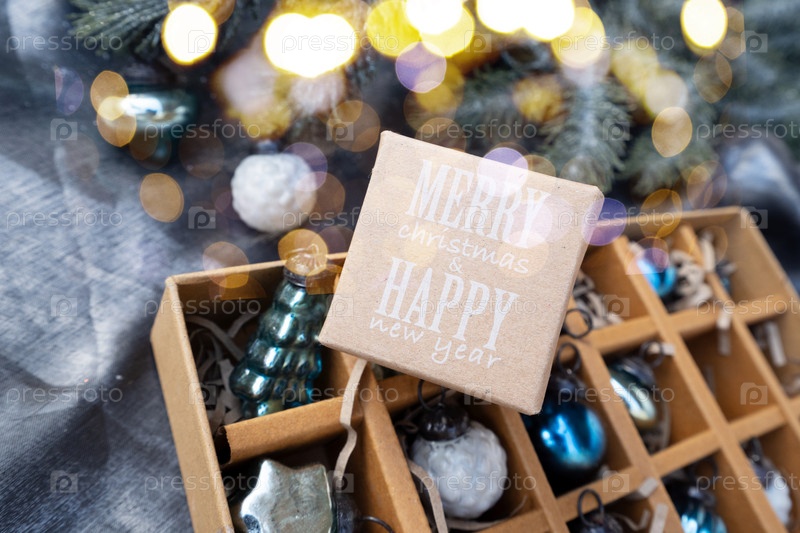 Коробка старинных рождественских украшений в зеленом и синем цветах на фоне серебряной ткани, готовая к праздничному убранству