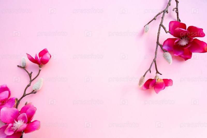 Цветущая ветка дерева magenta magnolia с цветами на розовом фоне
