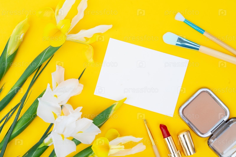 Яркая весенняя красавица плоскогубка с нарциссами, помада, порошковая компактная и макияжная кисти на ярком желтом фоне, мягкий естественный свет, свежий цветочный стиль,