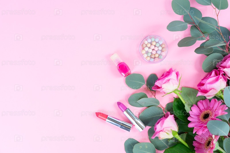 Цветочный дисплей красоты, женская пастельная подарочная аранжировка, мягкая романтическая сцена с цветами и аксессуарами, Элегантная коллекция цветущей косметики и украшений для празднования
