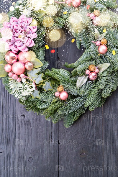 Рождественский венок украшен гирляндами на темном фоне