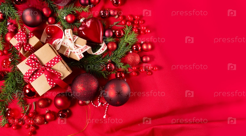 Монохромный красный рождественский образ жизни - праздничные украшения и подарочные коробки вид сверху границы