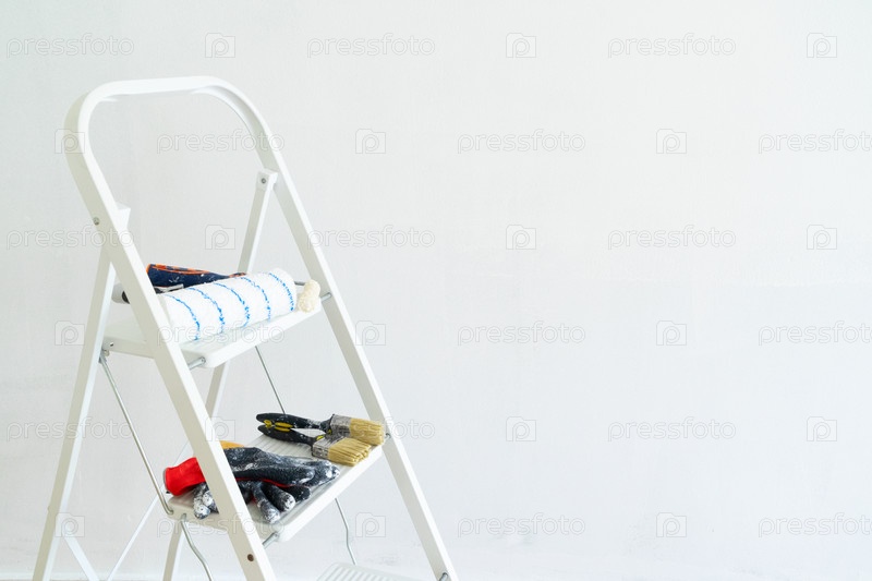 Концепция ремонта дома - старая квартира во время реставрации или ремонта с белыми гипсовыми стенами и лестницей