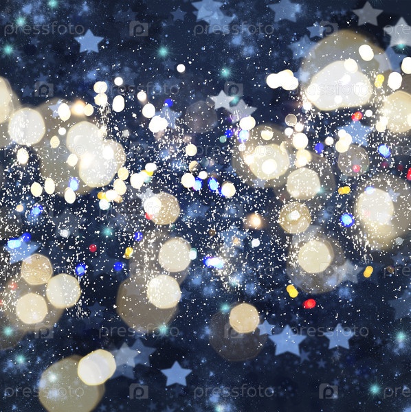 Рождественские желтые огни боке дефокусировали темно-синий фон со звездами