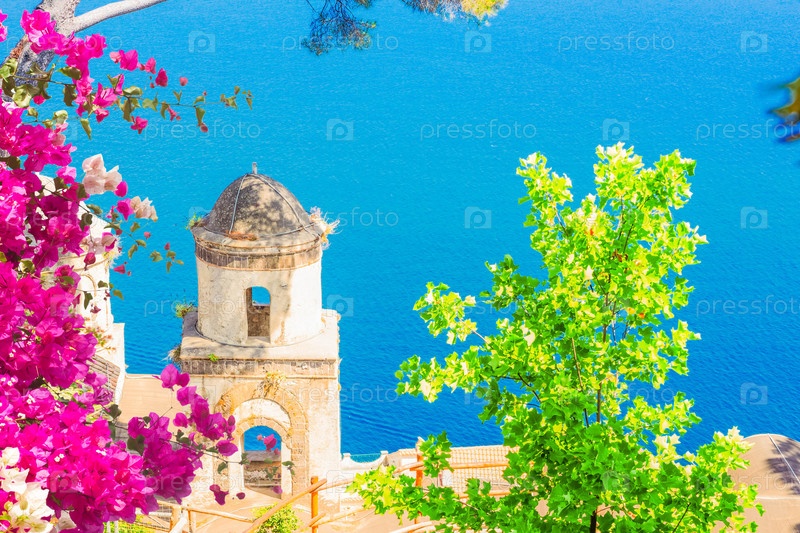 Belltower в деревне Равелло с видом на море, побережье Амальфи в Италии