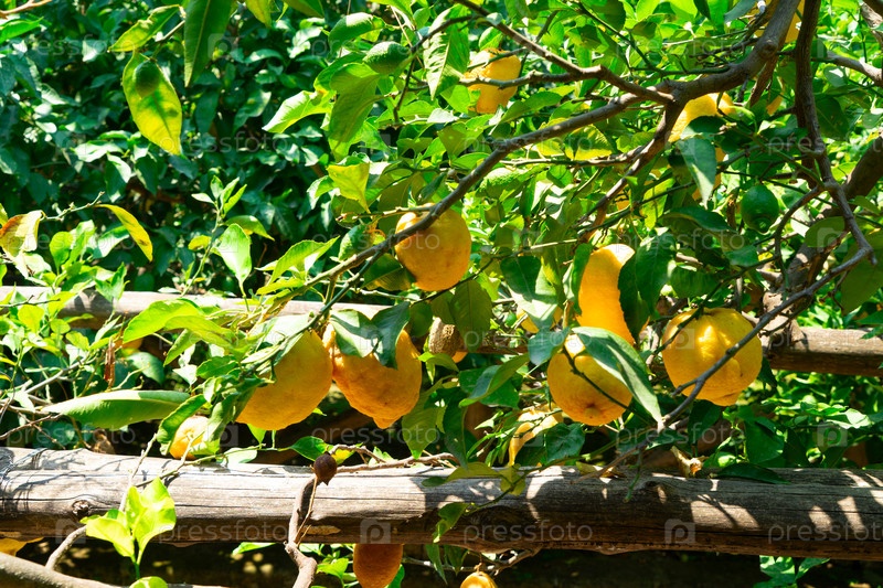 Вешать свежие плоды лимона в лимонном саду Сорренто летом