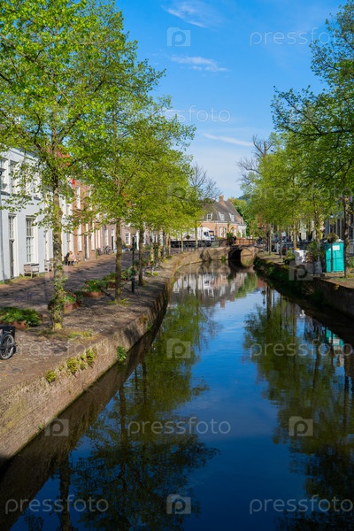 Фасады старых исторических Дома и деревья над водой канала, Амерсфорт, Нидерланды