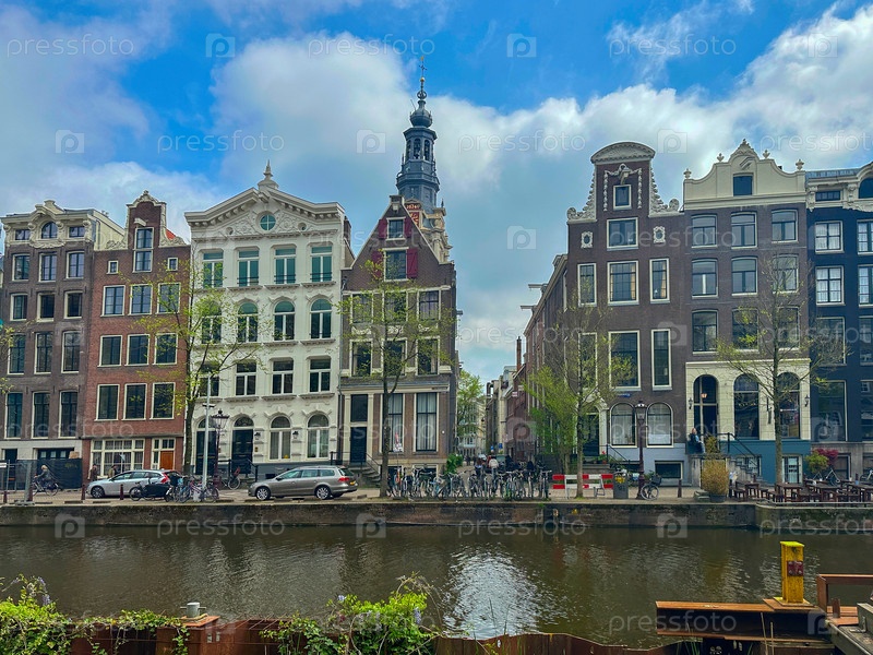 Фасады старых исторических Дома и деревья над водой канала, Амстердам, Нидерланды