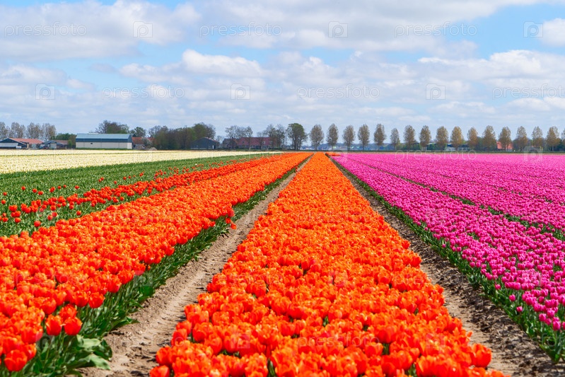 Голландские оранжевые поля тюльпанов в солнечный день