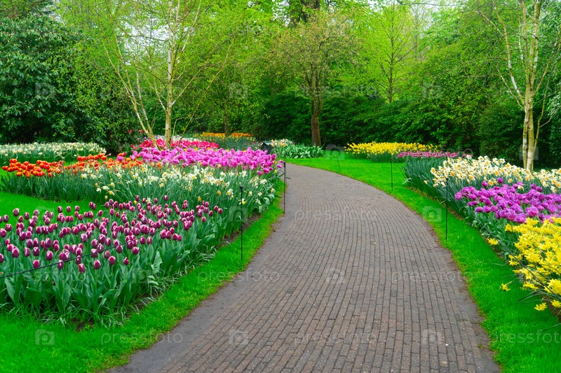 Путь через яркий сад тюльпанов в полном расцвете во время восхитительного весеннего сезона захватывает дух