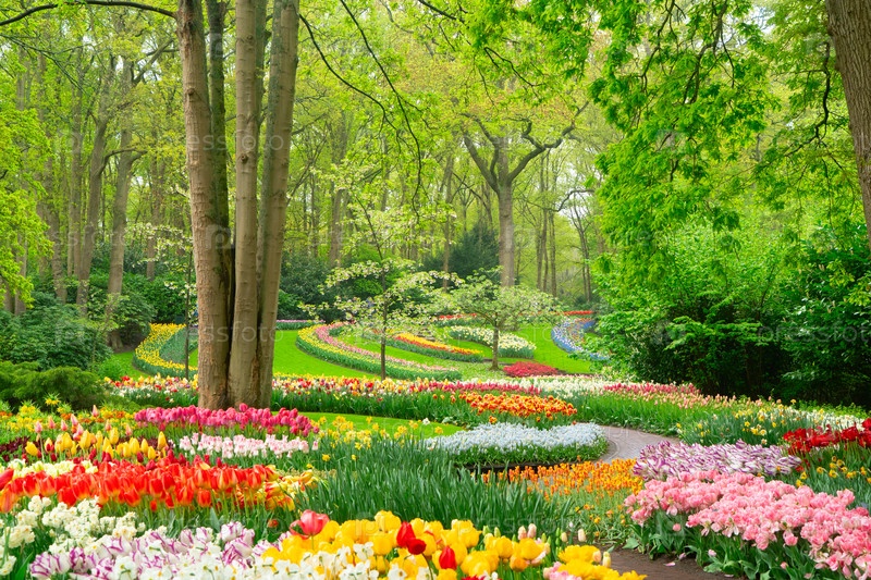 Путь через яркий сад тюльпанов в полном расцвете во время восхитительного весеннего сезона захватывает дух