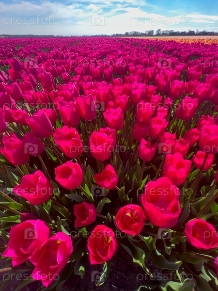 Низкоугольные розовые тюльпаны голубое небо, яркое поле, тянущееся к солнцу, лепестки с подсветкой, высокие зеленые стебли, яркое весеннее настроение, обзорная перспектива земли, захватывающая энергию и свежесть