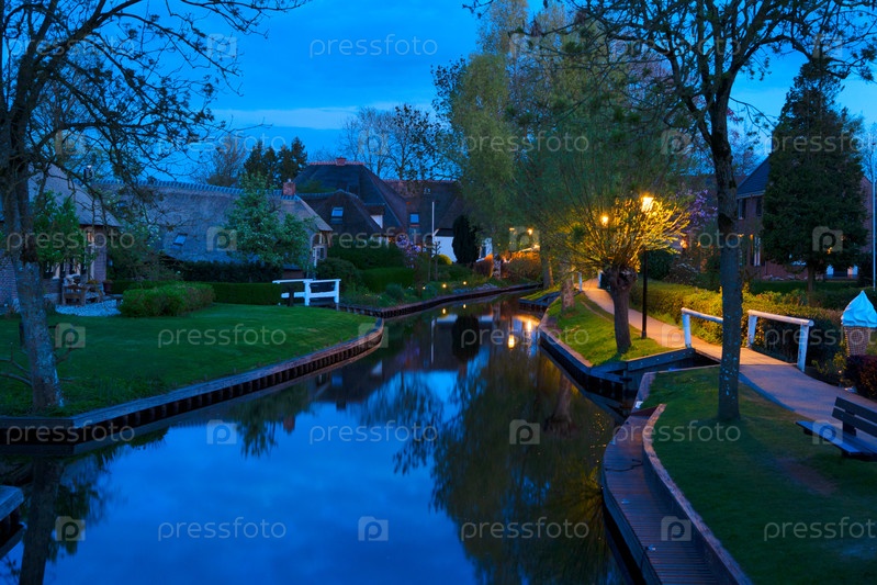Деревенская голландская традиционная страна небольшой старый город Giethoorn с каналами ночью, Нидерланды весной