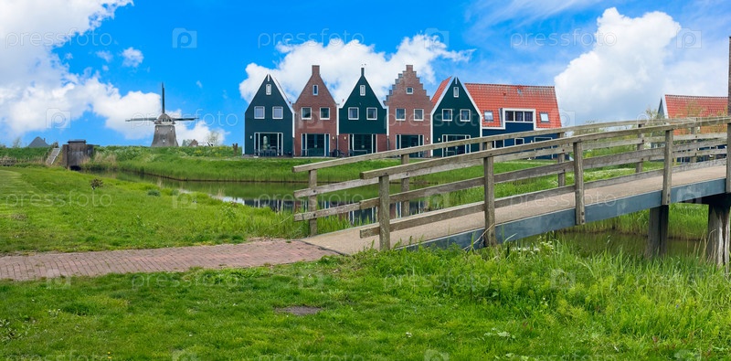 Сельская загородная улица Нидерландов, маленький старый город Волендам