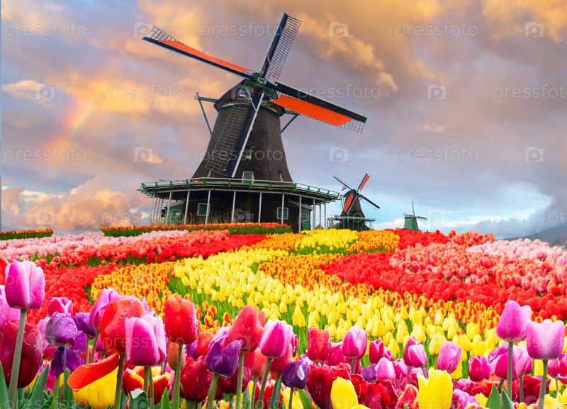 Одна голландская ветряная мельница над тюльпанами