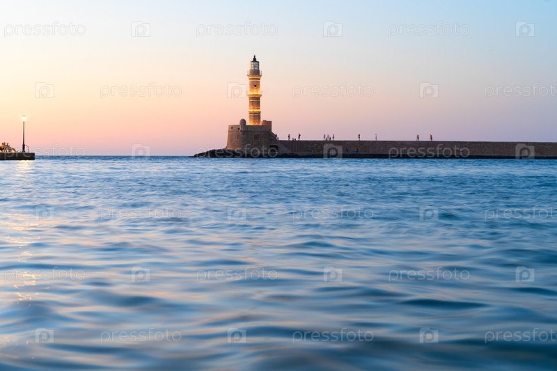 Залив Ханья с морем и маяком на солнечном летнем закате, Крит, Греция, формат веб-баннера