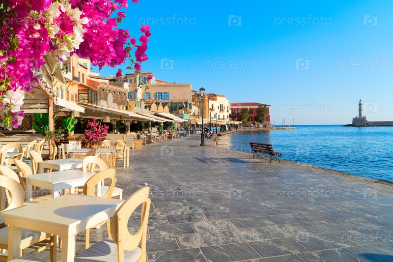 Кафе в венецианском гавани Ханья с историческими домами в солнечный день, Крит, Греция
