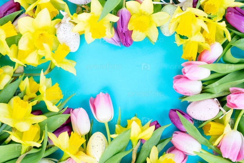 Тюльпаны и цветы нарциссов обрамляют копировальным пространством на синем фоне