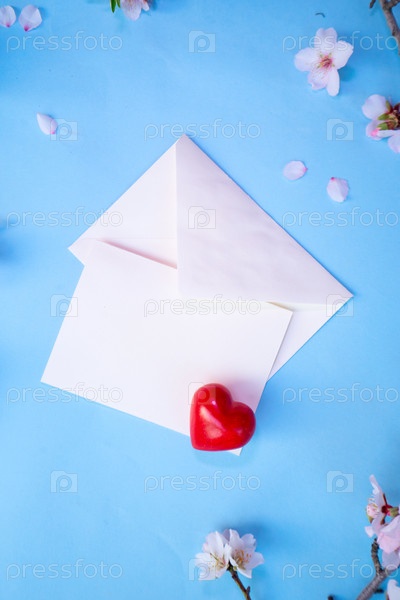 Весенняя вишня и миндальное дерево цветут цветами на синем фоне с копией на белом белом письме