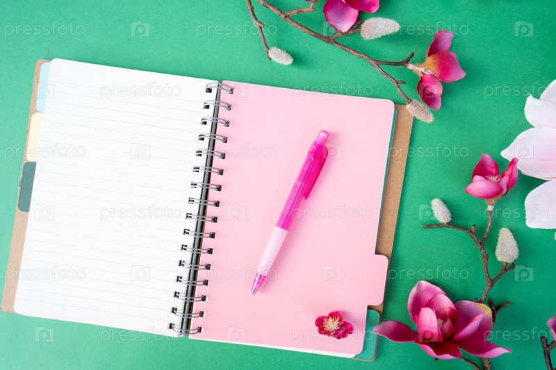 Цветущая розовая ветка дерева магнолии с цветами на зеленом фоне, открытая страница тетради для копирования
