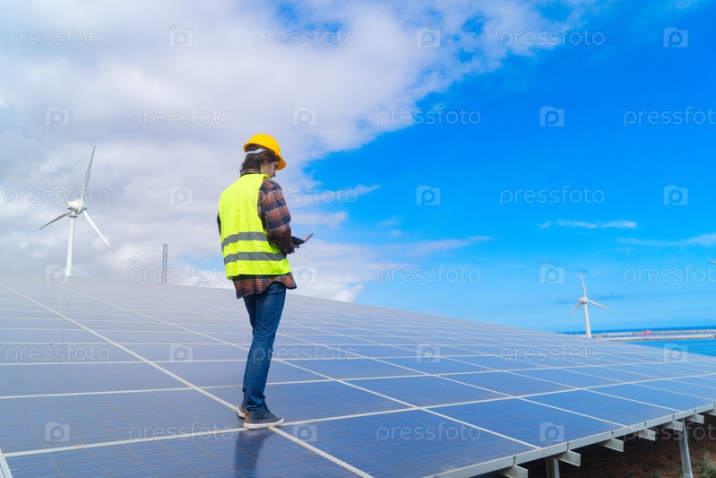 Концепция альтернативной энергии - инженер, стоящий перед солнечными батареями, зеленой энергией и экологически чистой промышленной концепцией
