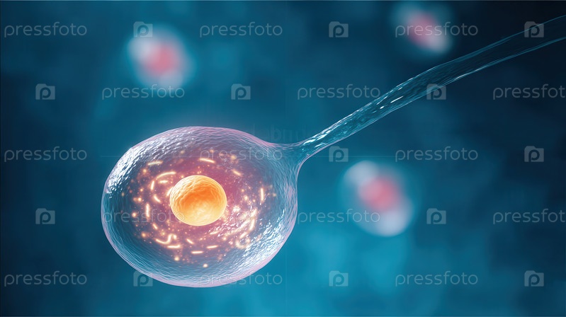 Микроскопические сперматозоиды с длинным хвостом возле светящегося яйца, детализированные интерьеры, размытый синий bg, слабые из фокусных клеток