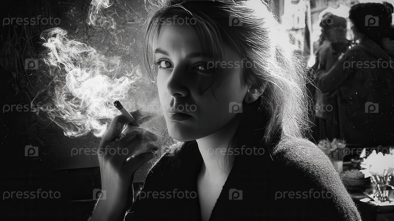 Черно-белый портрет молодой женщины со светлыми волосами, зажженной сигаретой, выдыхающей дым в тусклом баре. Высококонтрастное освещение, капризное, интроспективное