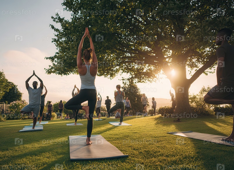 Группа практикующих йогу на открытом воздухе