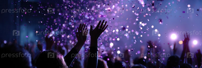 Силуэтированная толпа с поднятыми руками среди фиолетового конфетти под сценическими огнями, захватывающая энергичную концертную атмосферу с ярким боке и динамическим размытием движения