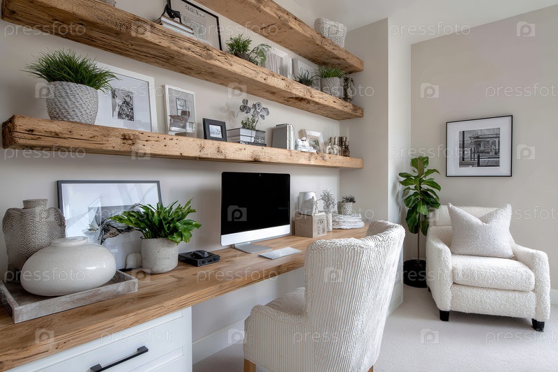 Современный деревенский домашний офисный деревянный стол с полками с растениями, керамикой. Белое кресло рядом с высоким фиговым листом. Естественный свет в нейтральном пространстве с белыми стенами и легкими деревянными акцентами