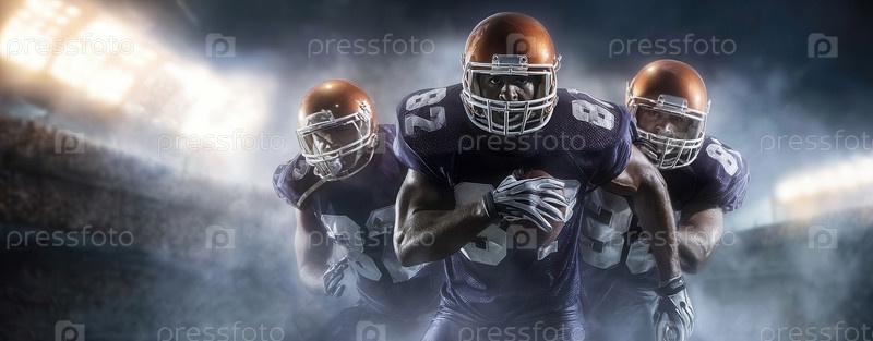 Три мускулистых афроамериканских футболиста в темно-синих униформах и оранжевых шлемах бегут через туман стадиона, центральный игрок сжимает коричневый футбол, за ними вспыхивают огни стадиона