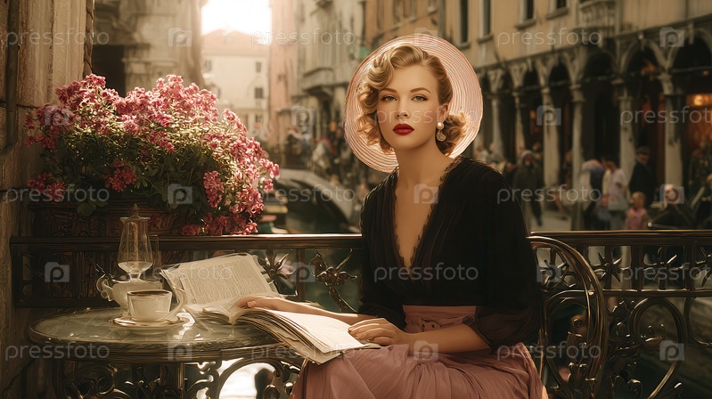 Блондинка с красными губами сидит на балконе, держа книгу, рядом со столом с кофе и розовыми цветами, с видом на канал и здания при свете